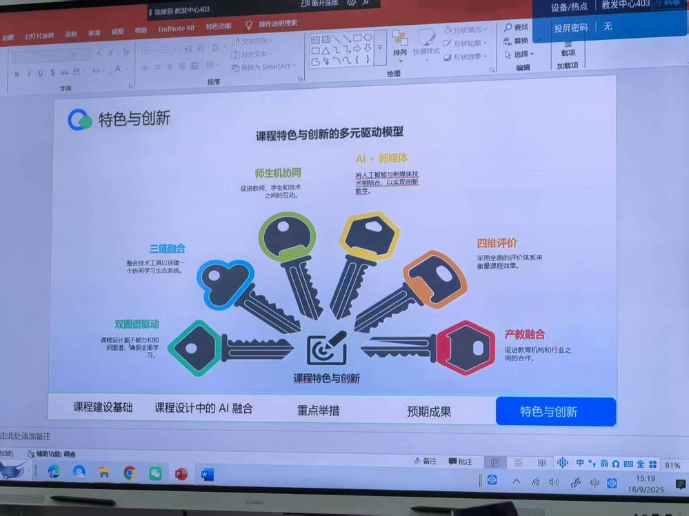 随后,陈老师汇报2025年人工智能示范课《新媒体运营》的课程建设进展。从课程目标定位、人工智能技术融入课堂的创新模式,到教学案例库搭建与考核方式改革等内容,陈老师逐一说明,展现了课程紧跟技术发展、贴合行业需求的建设思路。